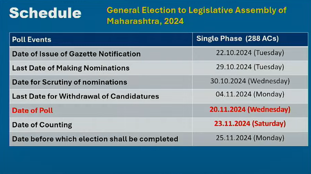 महाराष्ट्र विधानसभा निवडणूक 2024: निवडणूक तारीख आणि निकाल तारीख जाहीर