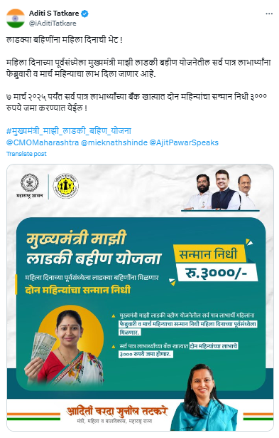 महिला व बालविकास मंत्री आदिती तटकरे यांनी मुख्यमंत्री माझी लाडकी बहीण योजनेबाबत मोठी घोषणा केली आहे. फेब्रुवारी आणि मार्च महिन्याचे प्रत्येकी १५०० रुपये असे एकूण ३००० रुपये पात्र महिलांच्या बँक खात्यात जमा केले जाणार आहेत. ७ मार्च २०२५ पर्यंत ही रक्कम खात्यात वर्ग केली जाईल, असं तटकरे यांनी सांगितलं.