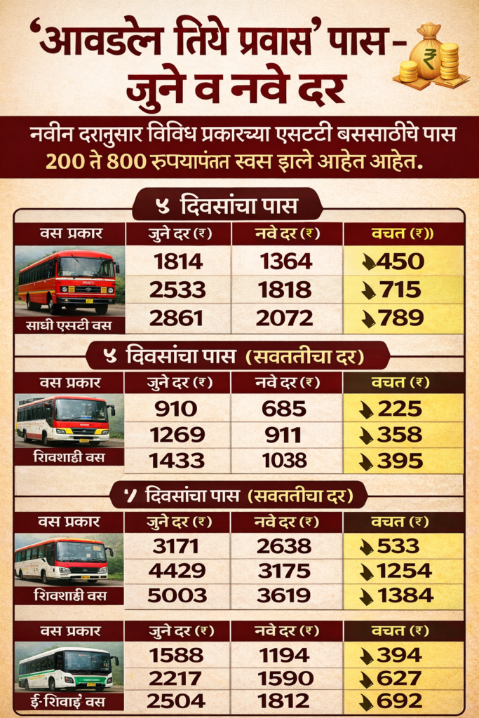 महाराष्ट्र राज्य परिवहन महामंडळाने (MSRTC) प्रवाशांसाठी दिलासादायक निर्णय घेतला असून, ‘आवडेल तिथे प्रवास’ या लोकप्रिय योजनेच्या पास दरात मोठी कपात करण्यात आली आहे. नव्या दररचनेनुसार विविध प्रकारच्या एसटी बससाठीचे पास २०० ते ८०० रुपयांपर्यंत स्वस्त झाले आहेत. ST Bus